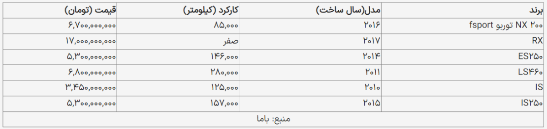با مطالعه جدول زیر اطلاعات کاملی درباره قیمت روز خودروهای لکسوس به دست خواهید آورد: