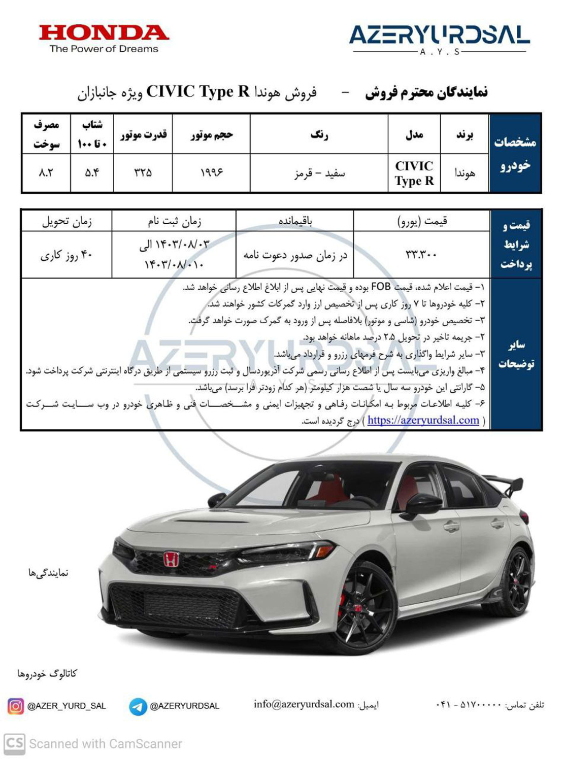 / به تازگی شرکت آذریوردسال شرایط فروش هوندا سیویک تایپ R ویژه جانبازان را اعلام کرده است که تحویل آن پس از ۴۰ روز کاری خواهد بود.