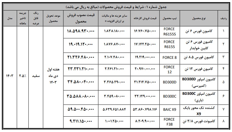 ایران جیب/ شرایط ثبت نام نقدی محصولات شرکت بهمن دیزل با قیمت قطعی، به صورت آنلاین از ساعت ١٠ صبح روز سه شنبه مورخ ١٤٠٣/٠٨/٠٨ تا ساعت ١٢ ظهر روز پنجشنبه مورخ ١٤٠٣/٠٨/٢٤ و یا زمان تکمیل ظرفیت از طریق درگاه عاملیت به شرح جدول ذیل ارائه می گردد.