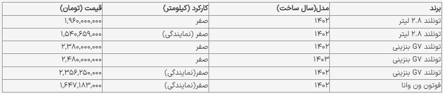 با مطالعه جدول زیر اطلاعات کاملی درباره قیمت روز خودروهای فوتون در بازار به دست خواهید آورد:
