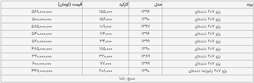 در آگهیهای بازار خودرو، پژو ۲۰۷ دندهای مدل ۱۳۸۹ با کارکرد ۳۲۰ هزار کیلومتر امروز چهاردهم آبان ماه ۳۲۰ میلیون تومان به فروش میرسد؛ همچنین در آگهی دیگری پژو ۲۰۷ دندهای مدل ۱۳۹۰ با کارکرد ۲۳۰ هزار کیلومتر، ۴۱۵ میلیون تومان قیمت خورده است.