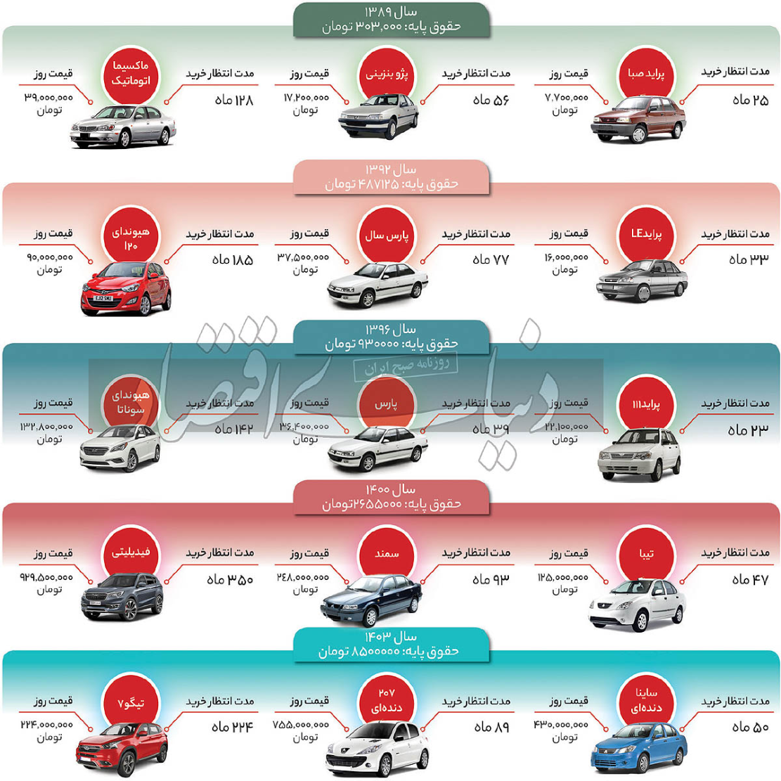 بر این اساس در سال 89 که پایه حقوق کارگران 303هزار تومان بود، ارزانترین خودروی بازار، یعنی پراید صبا، هفتمیلیون و 700هزار تومان قیمت داشت. بنابراین اگر فردی کل درآمد خود را تنها برای خرید خودرو پسانداز میکرد، 25ماه، معادل دو سال و یک ماه، طول میکشید تا بتواند این محصول را خریداری کند. همچنین در همان سال بهای پژو پارس 17میلیون و 200هزار تومان بود که مدت انتظار خرید آن برای فردی با درآمد پایه حقوق به 56ماه، معادل 4.5 سال، میرسید. برای خودرو با رده قیمتی بالا نیز در این سال ماکسیما اتوماتیک را انتخاب کردیم. این محصول در سال 89حدود 39میلیون تومان قیمت داشت، که 128ماه، معادل 10سال و 8ماه، پایه حقوق باید برای خرید آن جمعآوری میشد.