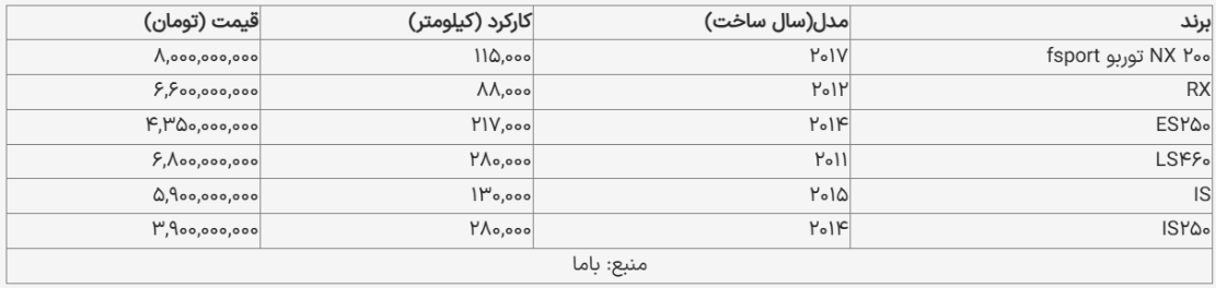 با مطالعه جدول زیر اطلاعات کاملی درباره قیمت روز خودروهای لکسوس به دست خواهید آورد: