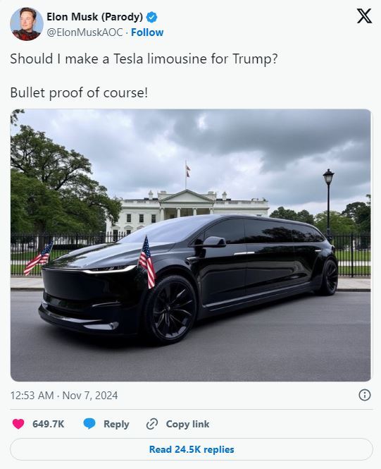 اما همانطور که میگویند، ممکن است در هر شوخی کمی حقیقت نهفته باشد! بنابراین شاید ساخت یک لیموزین تمام الکتریکی، طراحی و تولید شده در آمریکا برای رئیس جمهور در برنامه های ایلان ماسک که این روزها کاملا در کنار ترامپ حضور دارد، قرار بگیرد.