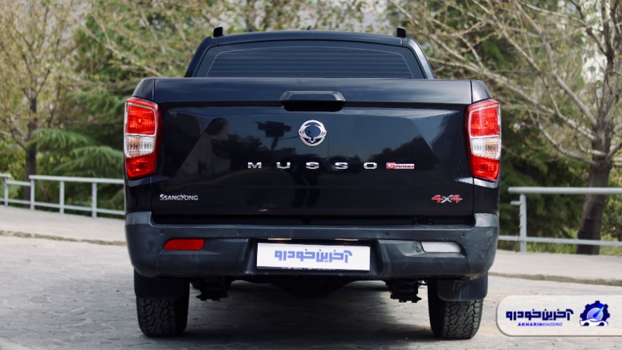 در نهایت در قسمت عقب، با طراحی ساده و آشنا از یک پیکاپ روبه رو هستیم که از ویژگی های خاصی برخوردار نمی باشد. استفاده از چراغ های عمودی در دو طرف و نیز خطوط بکار رفته بر روی درب قسمت بار، علاوه بر ایجاد هارمونی مناسب با سایر خطوط بدنه، تا حدی نیز از سادگی کلی این قسمت کاسته است. ضمن اینکه این خطوط، توانسته بر عریض تر کردن بدنه کمک کند. طراحی سپرهای پلاستیکی و مشکی که در واقع در امتداد قطعاتی پلاستیکی نمای جانبی می باشد در نهایت سادگی شکل گرفته است. طراحی سپرهای پلاستیکی و مشکی که در واقع در امتداد قطعاتی پلاستیکی نمای جانبی می باشد در نهایت سادگی شکل گرفته است. اما نکته جالب و شاید عجیبی که در نمای عقب موسو خان وجود دارد، این است که در هیچ قسمتی از بدنه، یعنی نه در اسپویلر سقف، نه در پشت شیشه های عقب و نه بر روی درب محفظه بار، اثری از چراغ ترمز سوم وجود ندارد.
