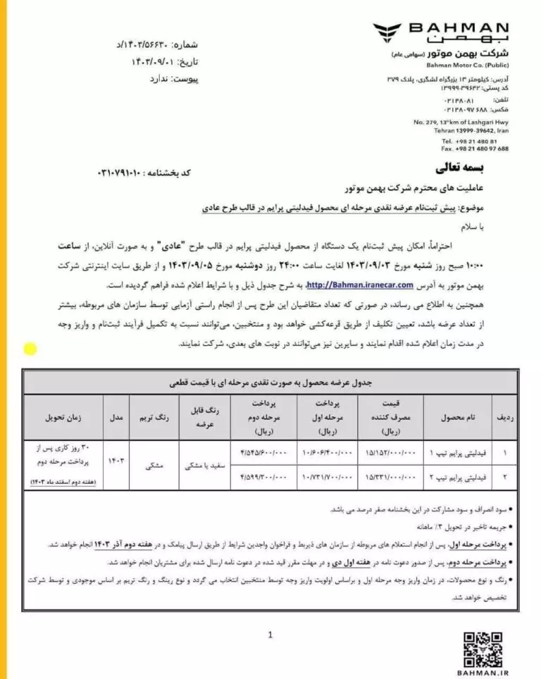 به گزارش پایگاه خبری ، شرایط فروش این دو محصول گروه بهمن از ساعت ۱۰ روز شنبه ۳ آذرماه ۱۴۰۳ آغاز شده و ثبت آن تا ساعت ۲۴ روز دوشنبه ۵ آذرماه ۱۴۰۳ ادامه خواهد داشت و ثبت نام و شرکت در این طرح تنها از طریق وبسایت رسمی شرکت بهمن موتور به آدرس https://bahman.iranecar.com/ انجام می شود. نکته قابل توجه در مورد این شرایط فروش این است که طبق اعلام رسمی شرکت بهمن موتور چنانچه تعداد افراد متقاضی بیشتر از تعداد عرضه باشد، محصول مورد نظر از طریق قرعه کشی به مشتریان اختصاص خواهد یافت.