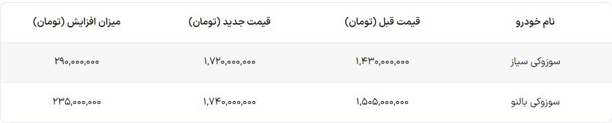 جدول افزایش قیمت سوزوکی بالنو و سیاز