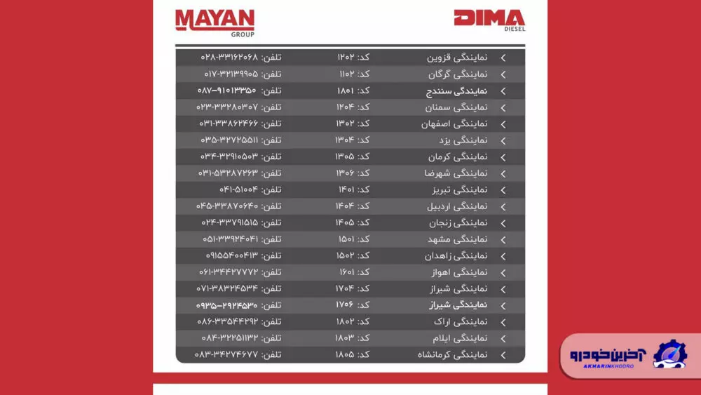 بر اساس شرایط اعلام شده، مشتریان می توانند از طریق نمایندگان مجاز گروه خودروسازی مایان از طریق بانک و لیزینگ های ذکر شده، خرید اقساطی خود را انجام دهند. بر این اساس مشتریان می توانند از طریق بانک سینا، بانک تجارت، لیزینگ اقتصاد نوین، لیزینگ کشاورزی و لیزینگ صنعت و معدن اقدام به خرید محصولات دیما بکنند. جهت کسب اطلاعات تکمیلی و آگاهی از جزئیات این شرایط فروش می توانید با شماره های زیر تماس بگیرید و یا با یکی از نمایندگی های رسمی گروه خودروسازی مایان که در تصویر زیر آمده است، تماس حاصل فرمایید.
