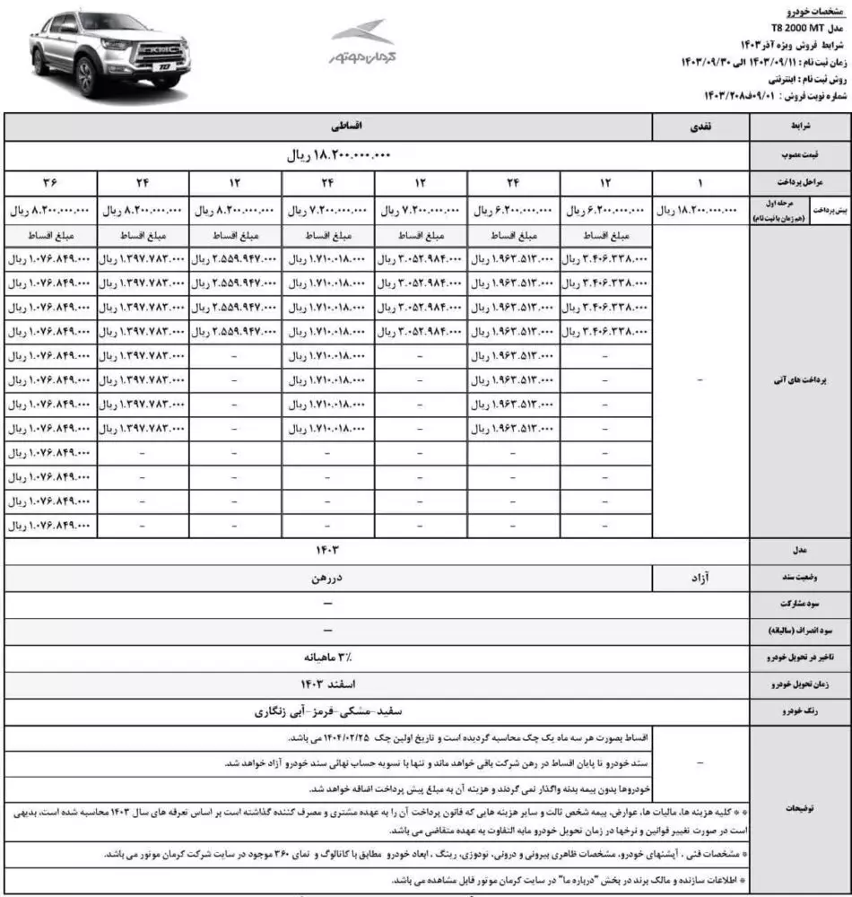 با این حال در شرایط فروش جدید کرمان موتور که برای آذرماه ۱۴۰۳ در نظر گرفته شده، KMC T8 به روش های نقد و اقساط به فروش می رسد و متقاضیان می توانند با پیش پرداخت های ۶۲۰,۰۰۰,۰۰۰ تومان، ۷۲۰,۰۰۰,۰۰۰ تومان و یا ۸۲۰,۰۰۰,۰۰۰ تومان و با اقساط ۱۲، ۲۴ و ۳۶ ماهه در این شرایط فروش شرکت کنند. لازم به ذکر است که اقساط به صورت هر سه ماه یک چک، محاسبه شده است و تاریخ اولین چک ۲۵ اردیبهشت ماه ۱۴۰۴ خواهد بود.