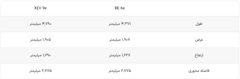 به خاطر ابعاد بزرگتر، صندوق عقب XEV 9e جادارتر بوده و فضایی برابر با ۶۵۵ لیتر را در اختیار مالک خود قرار میدهد. در زیر کاپوت جلوی این مدل صندوق دیگری با ظرفیت ۱۵۰ لیتر در دسترس است. در کراس اوور BE 6e صندوق عقب حجمی برابر با ۴۵۵ لیتر دارد؛ حجم صندوق جلو نیز برابر با ۴۵ لیتر میباشد. در جدول زیر میتوانید ابعاد دو مدل را به تفکیک مشاهده نمایید.