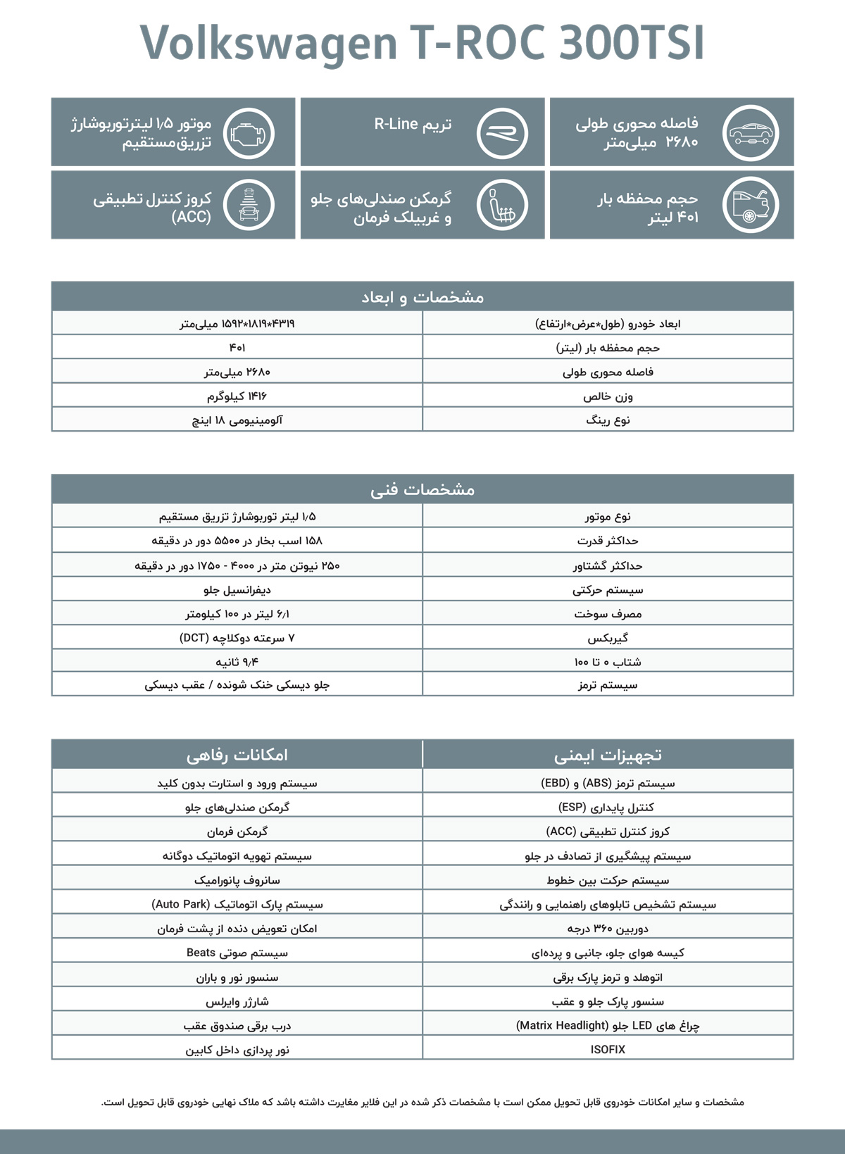 در بازار ایران به پیشرانه ۱.۵ لیتری توربوشارژر TSI مجهز است. این پیشرانه ۱۵۸ قدرت را با 250 نیوتن متر تولید می کند. جعبه دنده ۷ سرعته اتوماتیک دو کلاچه هم توان را به چرخ های جلوی این خودروی آلمانی می رساند. تعلیق مک فرسون در بخش جلو و تعلیق مولتی لینک در قسمت عقب فولکس واگن T-Roc دیده می شود. این خودروی وارداتی می تواند شتاب صفر تا ۱۰۰ کیلومتر بر ساعت را در ۸.۶ تا ۹.۴ ثانیه (بر اساس کالیبراسیون) ثبت کند. همچنین حداکثر سرعت تیراک نزدیک به ۲۱۵ کیلومتر بر ساعت اعلام می شود.
