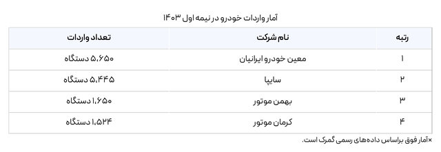 طبق اعلام گمرک، طی شش ماهه ابتدایی امسال، شرکتهای معینخودرو ایرانیان، سایپا، بهمنموتور و کرمانموتور به ترتیب، بزرگترین واردکننده خودروهای سواری به کشور بودهاند.