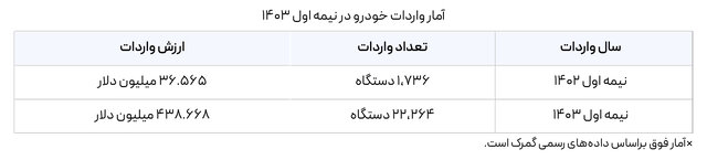 طبق آمار گمرک، از ابتدای سال جاری تا پایان آبان ماه، ۲۹ هزار و ۴۱۸ دستگاه خودرو سواری به ارزش بالغ بر ۶١٧ میلیون دلار وارد کشور شده و بطور قطعی از گمرکات کشور ترخیص شده است. با احتساب واردات حدوداً ۱۱ هزار و ۸۷۴ دستگاه خودرو سواری به ارزش ۲۳۴ میلیون و ۵۶۰ هزار دلار تا پایان سال گذشته، تا پایان آبان ماه، بالغ بر ۴١ هزار دستگاه خودرو وارد کشور و ترخیص شده است.