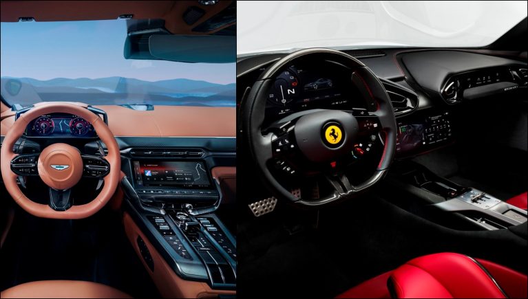 فضای داخلی هر دو، شاهکار برندهای سازنده را به رخ رقیبان میکشد. هر دو از صندلیهای چرمی، پدالهای تعویض دنده، نمایشگرهای مرکزی، داشبورد لوکس مجهز به دکمههای فیزیکی متعدد، نمایشگر روبهروی راننده، ظرفیت کافی برای سواری دو سرنشین و… سود میبرند. با این وجود، تجربه نشستن در آستونمارتین حس لوکسبودن را بیشتر از فراری منتقل میکند؛ گویا هر دو شرکت هدف اصلی خود را در طراحی فضا کابین در نظر داشتهاند و آن را بهگونهای طراحی کردهاند که روحیه برند را به سرنشینان یادآوری کند.