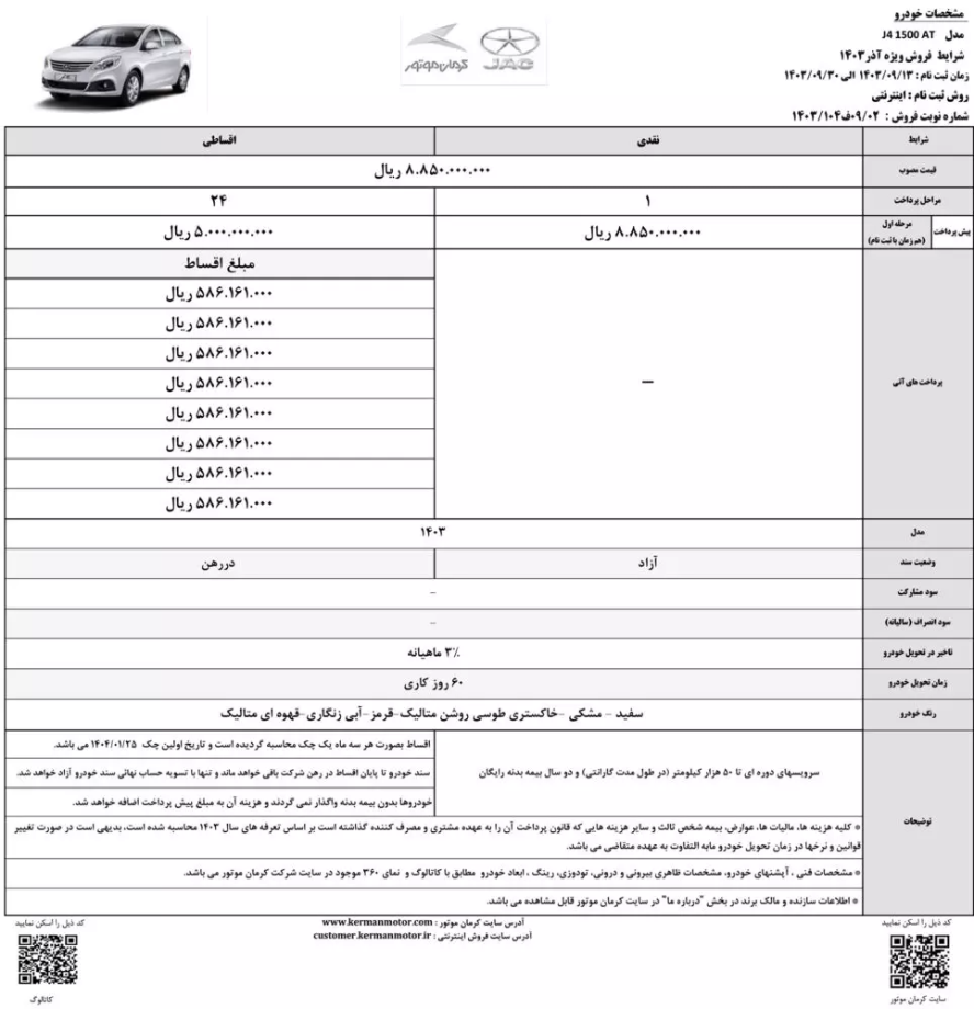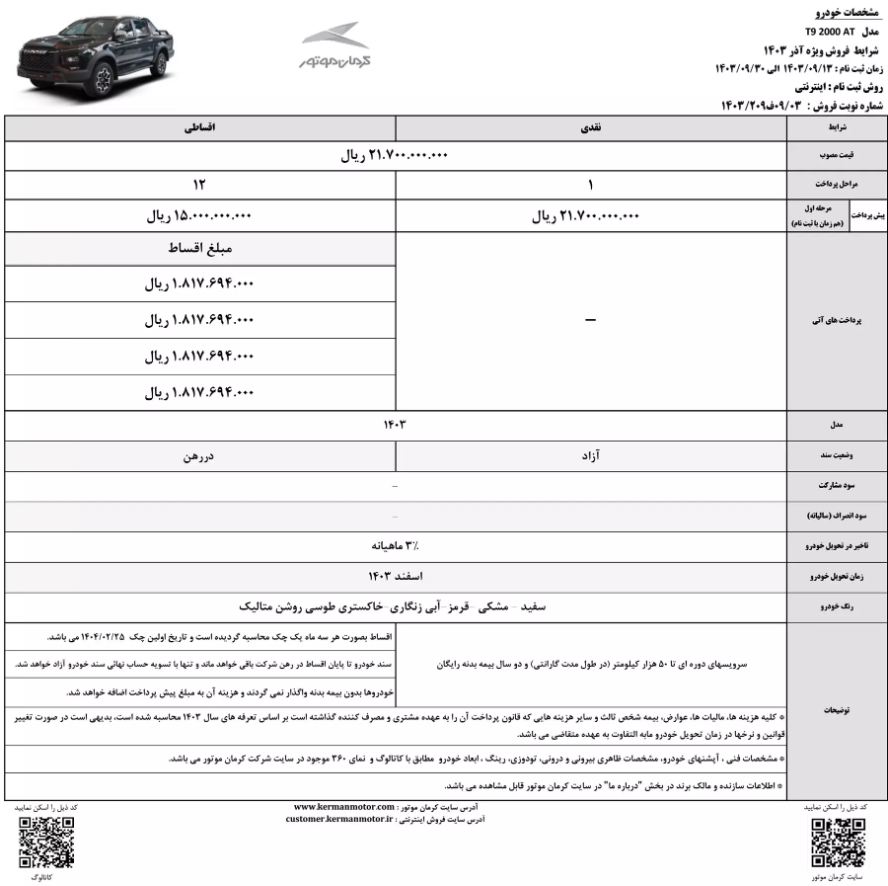 کرمان موتور شرایط فروش نقد و اقساط دو خودروی جک J4 و KMC T9 را اعلام کرده است. بر اساس اطلاعیه فروش منتشر شده، کی ام سی T9 با قیمت ۲ میلیارد و ۱۷۰ میلیون تومان به فروش می رسد و دو مدل فروش نقد و اقساط ۱۲ ماهه برای ایم محصول ارائه شده است. سود تاخیر ۳ درصد ماهیانه محاسبه می شود و موعد تحویل این پیکاپ اسفند ۱۴۰۳ اعلام شده است. جک J4 هم با قیمت مصوب ۸۸۵ میلیون تومان و در دو مدل نقدی و اقساط ۲۴ ماهه به فروش می رسد. جریمه تاخیر ۳ درصد ماهیانه محاسبه می شود و موعد تحویل خودرو پس از ۶۰ روز کاری خواهد بود.
