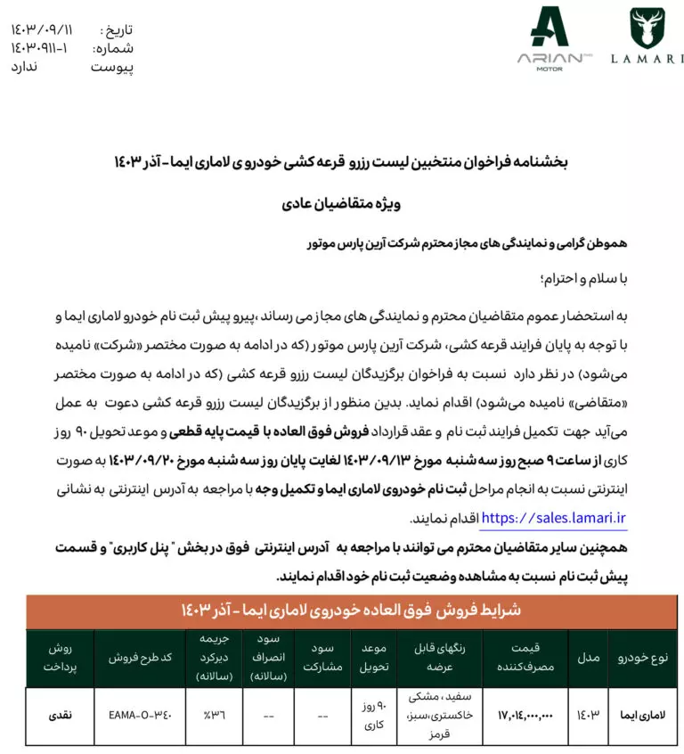 / در جدیدترین بخشنامه فروش شرکت آرین پارس موتور ویژه لیست رزرو قرعه کشی، قیمت جدید لاماری ایما با افزایش اعلام شده است.