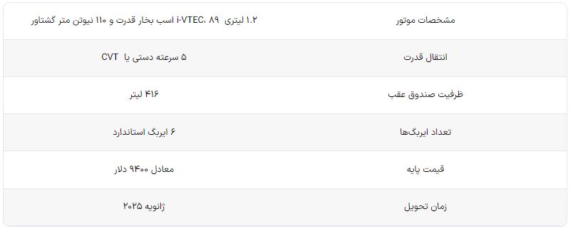 در جدول زیر میتوانید مشخصات هوندا امیز ۲۰۲۵ را به طور خلاصه مشاهده نمایید.