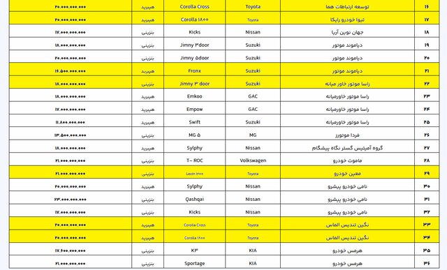 محصولات اضافه شده به لیست که اکثراً هم دو مدل از محصولات گروه تویوتا هستند اما توسط شرکتهای واردکننده مختلف وارد میشوند، با رنگ زرد مشخص شدهاند.