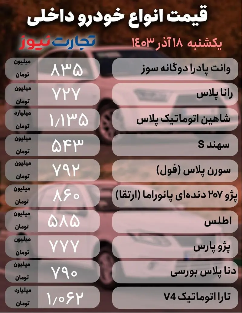 قیمت خودرو امروز ۱۸ آذر ۱۴۰۳/ سیر صعودی بازار ادامه دارد