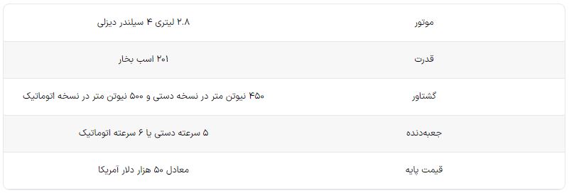 موتور ۸ سیلندر دیزلی به دلیل سختگیرانه تر شدن قوانین آلایندگی جای خود را به یک موتور دیزلی ۲.۸ لیتری ۴ سیلندر داده است. این موتور توانایی تولید ۲۰۱ اسب بخار قدرت و ۴۵۰ نیوتن متر گشتاور را دارد. علی رغم حجم خیلی کمتر، میزان قدرت تولیدی این موتور کوچک با موتور ۸ سیلندر قبلی برابر است؛ نکته جالبتر اینکه این موتور حتی ۲۰ نیوتن متر گشتاور بیشتری تولید میکند.