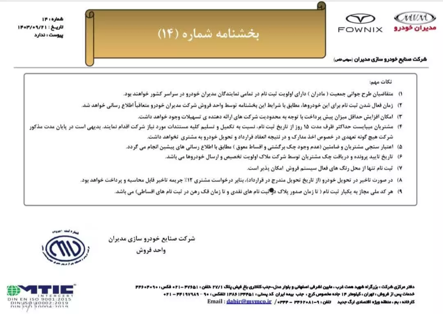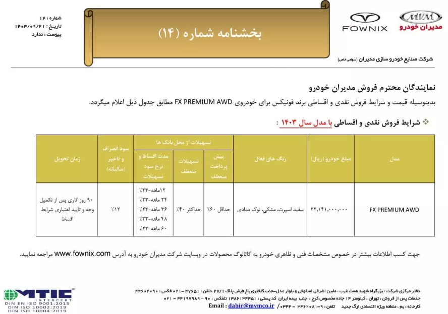 لازم به ذکر است که زمان تحویل فونیکس FX دو دیفرانسیل ۹۰ روز کاری پس از تکمیل وجه و یا تایید اعتباری شرایط اقساطی بوده و سود انصراف و تاخیر سالانه آن ۱۲ درصد اعلام شده است.