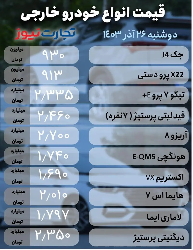 قیمت خودرو امروز ۲۶ آذر ۱۴۰۳/ کدام خودرو ۷۰ میلیون تومان ارزان شد؟