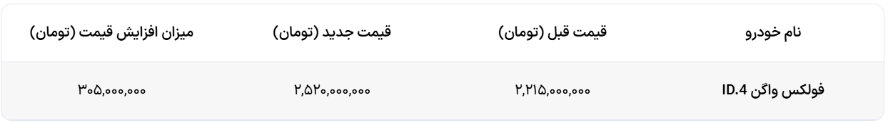 طبق اطلاعات رسیده به دست پایگاه خبری آخرین خودرو، با توجه به اینکه قیمت بسیاری از خودرو های داخلی و وارداتی دست خوش تغییر شده است، قیمت فولکس واگن ID.4 نیز با افزایش روبرو شده و قیمت پایه آن افزایش پیدا کرده است که این افزایش قیمت اتفاق دور از ذهن نبوده و با توجه به افزایش قیمت برخی از خودرو ها و همچنین نوسانات بازار ارز امری طبیعی به شمار می رود.