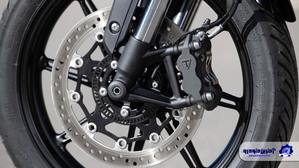 سیستم ترمز نیز بهبود یافته است و اکنون شامل کالیپر شعاعی چهار پیستونی جدید با برند Triumph از مدل Tiger Sport 660 است که روی یک دیسک بزرگتر ۳۲۰ میلیمتری نصب شده و با ABS مخصوص پیچها همراه شده است. اگرچه این ترمز به اندازه موتورسیکلتهای ورزشی قوی نیست، اما بیش از حد نیاز پاسخگو است.