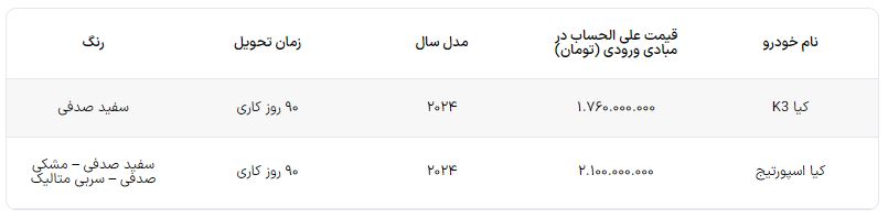 به گزارش پایگاه خبری ، هنوز قیمت مصوب کیا K3 و کیا اسپورتیج شرکت هرمس خودرو توسط سازمان حمایت تعیین نشده است. برای همین در بخشنامه فروش دو محصول کیا که توسط هرمس خودرو منتشر شده است، قیمت خودروها به صورت علی الحساب لحاظ گردیده و قرار است تا خودروها با موعد تحویل ۹۰ روز کاری به دست مشتریان برسد. در حال حاضر برندگان دو محصول کیا در سامانه وارداتی ها می توانند با مراجعه به وبسایت Kia-iran.ir نسبت به دریافت بخشنامه و طی فرایند ثبت نام اقدام کنند. متقاضیان باید در نظر داشته باشند که پس از اعلام قیمت قطعی محصولات کیا در مبادی ورودی توسط سازمان حمایت، هزینه های جانبی شماره گذاری، بیمه، مالیات و… به بهای خودرو اضافه خواهد شد.