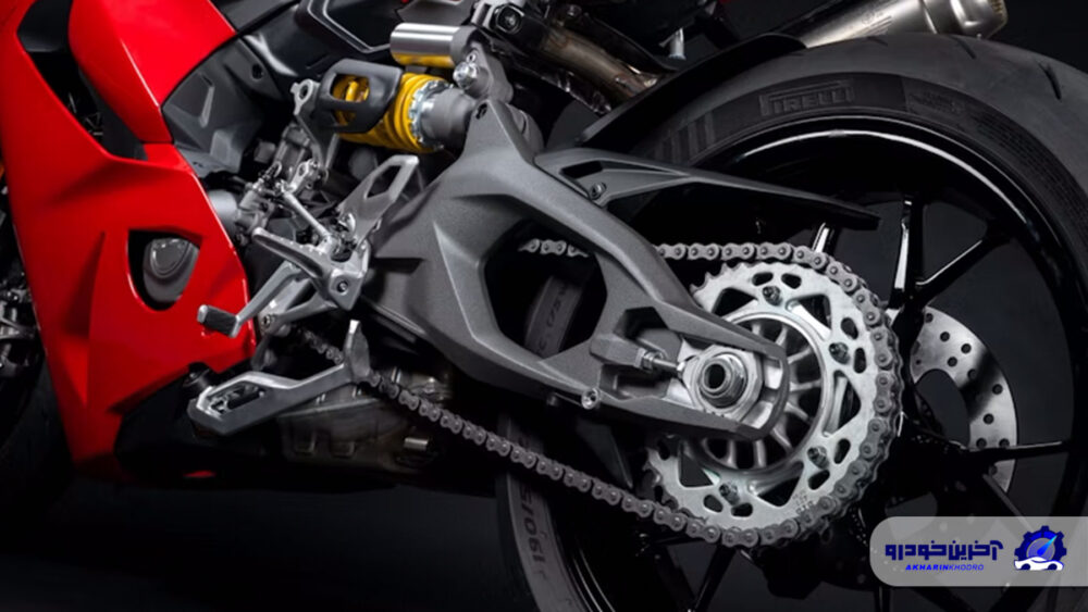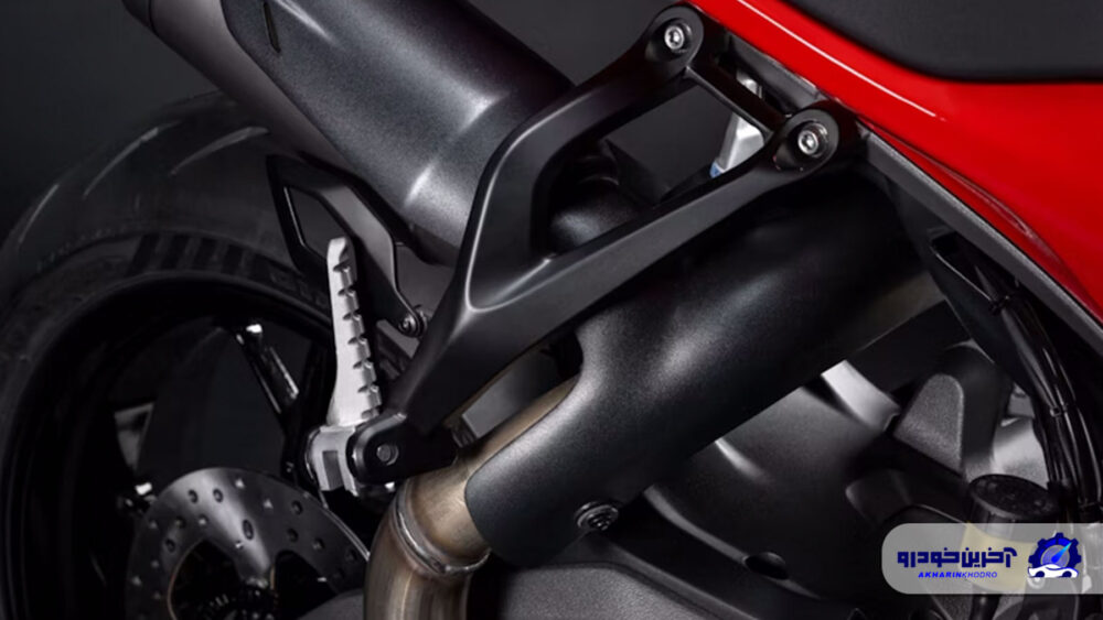در عقب، یک بازوی دوطرفه نصب شده است – تغییری دیگر از سنتهای دوکاتی برای دستیابی به عملکرد بهتر – که بهصورت مستقیم به موتور متصل است. یک استابلایزر فرمان Ohlins نیز بهعنوان گزینه قابل سفارش موجود است.