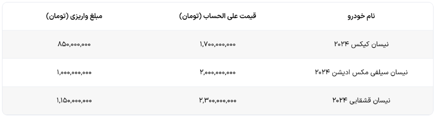 شرکت نامی خودرو پیشرو با ۳ محصول در دور اخیر عرضه خودروهای وارداتی حاضر بود و حالا نتایج اولویت دهی خودروهای مشخص شده است. بر اساس پیامک های واریز ارسال شده توسط این شرکت، مشتریان می توانند نسبت به پرداخت نیمی از مبلغ علی الحساب خودروهای نیسان کیکس، نیسان قشقایی و نیسان سیلفی هیبرید اقدام نمایند. تمامی این خودروها با مدل ۲۰۲۴ عرضه شده اند و موعد تحویل خودروها ۹۰ روز کاری پس از پرداخت خواهد بود. در جدول زیر می توانید قیمت علی الحساب و مبلغ پرداختی برای هر مدل را مطالعه کنید :