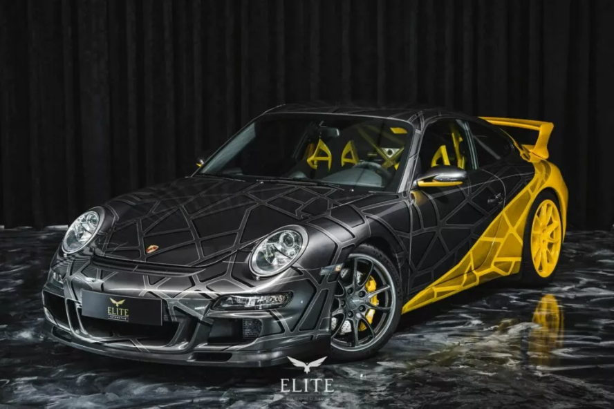 پاسخ این سوال به بدنه بیرونی باز میگردد؛ جایی که «ریچارد اورلینسکی»، مجسمهساز فرانسوی و هنرمند نئوپاپ، هنر خود را نشان داده است. او با صرف ۵۰۰ ساعت زمان روی طرح بدنه متمایز این 911GT3، بیش از ۱۰ لایه رنگ خاکستری و ۱۱ لایه رنگ زرد کار کرده است. الگوهای طرح بدنه بر پایه طرحهای پیشین این هنرمند اروپایی انجام شده و امضای شخصی او نیز در بخش عقب خودرو نقش بسته است.