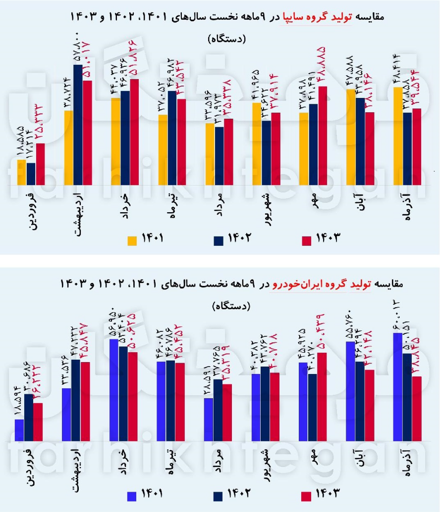 طبق دادههای گزارش ماهانه خودروسازان تولید ایرانخودرو در ۹ماهه امسال ۳۷۵ هزار و ۶۱۵ دستگاه بوده که نسبت به مدت مشابه سال گذشته کاهش نزدیک به ۲۱ هزار دستگاهی (۵.۲ درصد کاهش) داشته است. همچنین تولید امسال این خودروساز نسبت به تولید ۹ماهه سال ۱۴۰۱ نیز کاهش ۱۰.۲ هزار دستگاهی را نشان میدهد. وضعیت تولید در گروه سایپا کمی متفاوتتر از گروه ایرانخودرو است. به گفته این خودروساز در ۹ماهه امسال تعداد ۳۷۱ هزار و ۳۹۷ دستگاه در شرکتهای سایپا (شرکت اصلی)، پارسخودرو، زامیاد و سایپا دیزل تولید شده که نسبت به مدت مشابه سال گذشته رشد ۳.۵ درصدی (۱۲ هزار و ۵۶۳ دستگاه) داشته و از تولید ۹ماهه سال ۱۴۰۱ حدود ۲۳.۵ هزار دستگاه (۶.۸ درصد) بیشتر است.