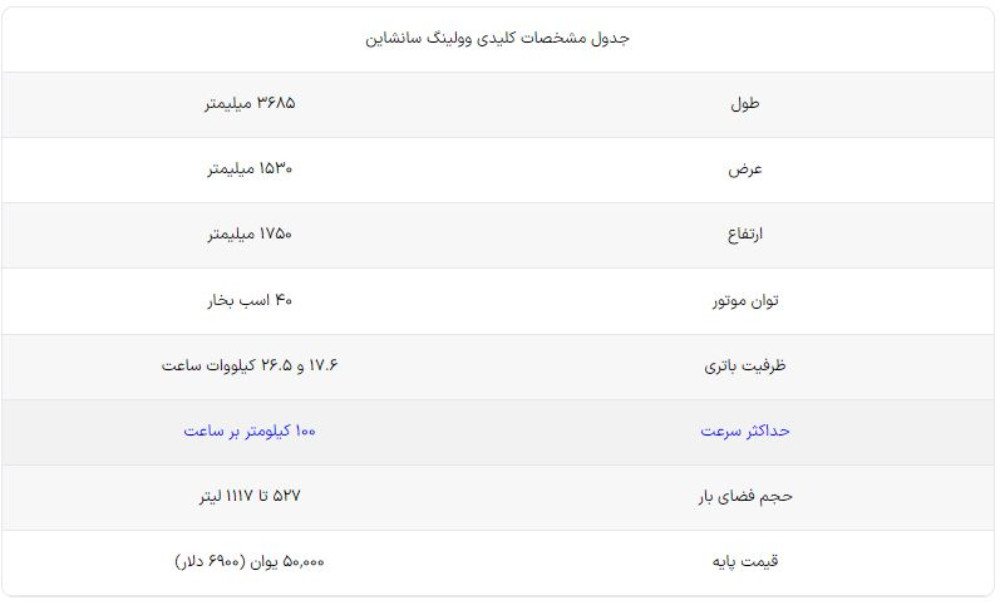 در جدول زیر میتوانید مشخصات کلیدی وولینگ سانشاین را مشاهده نمایید.
