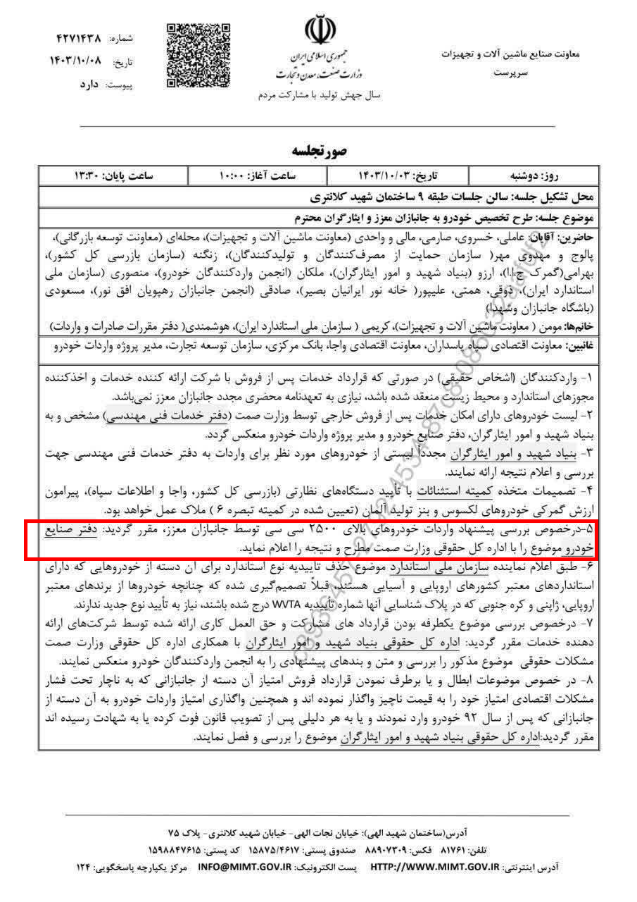 به تازگی صورتجلسه ای مربوط به جلسه طرح تخصیص خودرو به جانبازان معزز منتشر شده که نشان می دهد موارد جدیدی در مورد واردات خودروی جانبازی مطرح شده است. در این جلسه مسائل مربوط به استاندارد و محیط زیست مطرح شده است اما مهم ترین مساله در این جلسه مطرح شدن واردات خودروهای بالای ۲۵۰۰ سی سی بوده است. بر این اساس قرار است این مورد توسط دفتر صنایع خودروی وزارت صمت با اداره حقوقی همان وزارت بررسی می شود و نتیجه به زودی اعلام خواهد شد. همچنین در این جلسه قرار بر این شده تا قراردادهای یکطرفه مشارکت و حق العمل کاری برخی شرکت ها با جانبازان معزز توسط اداره کل حقوقی بنیاد شهید و امور ایثارگران با همکاری اداره کل حقوقی وزارت صمت بررسی شود و و بند های پیشنهادی به انجمن واردکنندگان خودرو ارائه گردد.