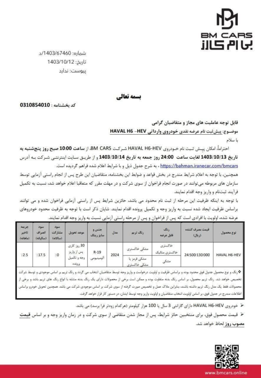 برند هاوال یکی از معروف ترین خودروسازان چینی است که جدا از اینکه در خود کشور چین طرفداران بسیار زیادی دارد در کشور های حاشیه خلیج فارس نیز توانسته آمار فروش به نسبت خوبی را از خود به جا بگذارد. همانطور که می دانید این شرکت سابقه همکاری با گروه بهمن را داشته است و به همین دلیل محصولات آن در دور جدید واردات توسط این شرکت عرضه می شود و گروه بهمن تا کنون توانسته هاوال H6 هیبرید را وارد بازار ایران کند. شرکت بی ام کارز که بازوی واردات گروه بهمن در زمینه واردات به حساب می آید اخیرا شرایط فروش جدیدی را خارج سامانه و به صورت محدود برای هاوال H6 هیبرید اعلام کرده است.