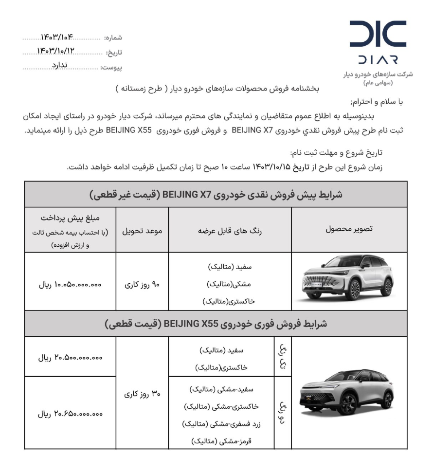 به گزارش پایگاه خبری ، این شرایط فروش از ۱۵ دی ماه برقرار است و متقاضیان می توانند با مراجعه به نمایندگی های دیار خودرو فرایند ثبت نام را طی کنند. بایک X7 با قیمت غیر قطعی و موعد تحویل ۹۰ روز کاری به فروش می رسد. این خودرو پیش پرداخت یک میلیارد و ۵ میلیون تومانی را در هنگام ثبت نام نیاز دارد. دیار خودرو X7 را به صورت مونتاژی با رنگ های سفید، مشکی و خاکستری عرضه می کند.