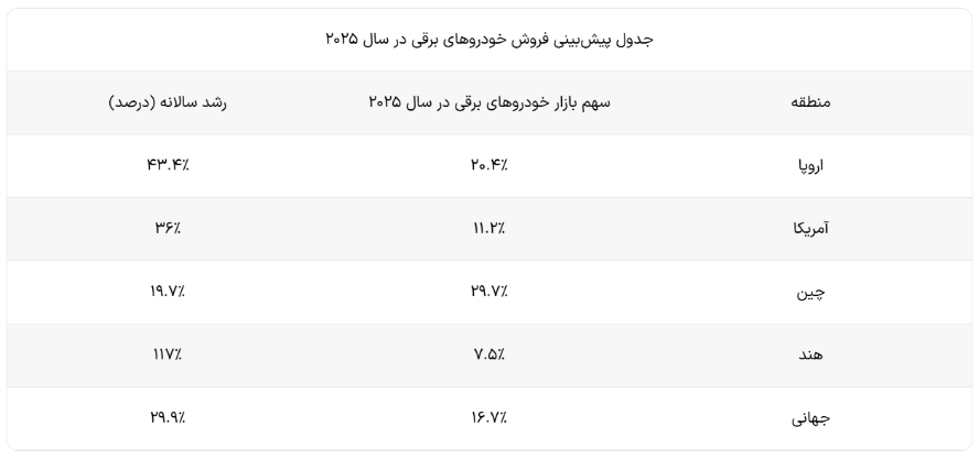 در آن سوی دنیا و در ایالات متحده، رشد ۳۶ درصدی برای خودروهای برقی پیشبینی شده؛ در صورت تحقق این میزان رشد، سهم مدلهای الکتریکی از کل بازار آمریکا در سال ۲۰۲۵ به ۱۱.۲ درصد خواهد رسید. البته واضح است که سیاستهای دولت ترامپ و تصمیمات مربوط به تعرفهها میتواند تأثیر قابلتوجهی بر این روند داشته باشد.