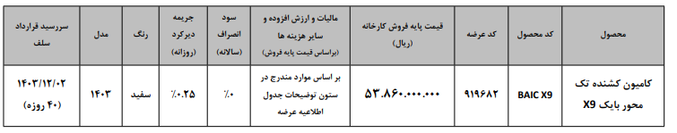 کشنده بایک X9 در این عرضه تنها با رنگ سفید قابل سفارش است و خودرو با مدل ۱۴۰۳ و پس از ۴۰ روز به خریداران عرضه میشود.