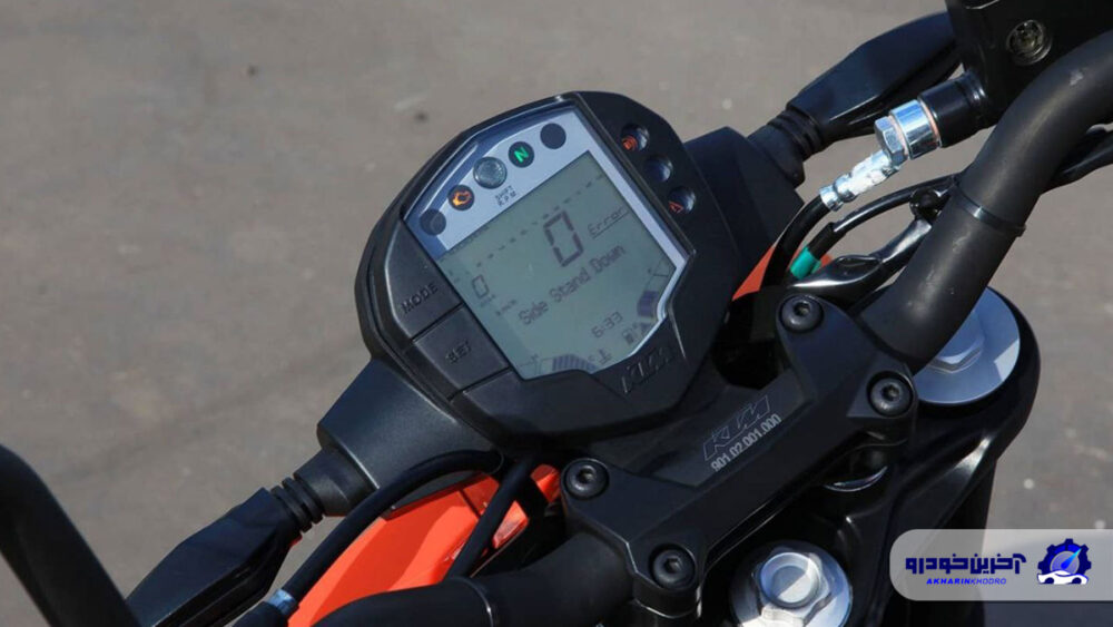 نمای روبرویی راکب کمی متفاوت از سایر موتورسکلت ها است شاید به نوعی این برند اتریشی به سبک خودروهای آلمانی سعی در انحصاری کردن بعضی از المانهای طراحی دارد. برای مثال زاویه صفحه کیلومتر و نوع طراحی آن کاملا متفاوت است. صفحه کیلومتر کی تی ام، متشکل از یک LCD نارنجی رنگ طراحی شده است. رنگ نارنجی هماهنگی مناسبی با اصالت برند کی تی ام دارد اما با یک صفحه نمایش کاملا ساده طرف هستیم که امروزه هوندا ۱۲۵ها هم از این قابلیت استفاده میکنند. ابعاد صفحه نمایش نسبتا کوچک است اما در نوع خود اطلاعات کافی از جمله میزان سوخت، مسافت طی شده، مصرف سوخت لحظهای و دور موتور را در اختیار راکب موتور قرار خواهد داد. جایگاه سوییچ موتور از دیگر وجه تمایز این موتور اتریشی است که به باک موتور متصل شده و برخلاف عموم موتورها در ناحیه کیلومتر تعبیه نشده است.