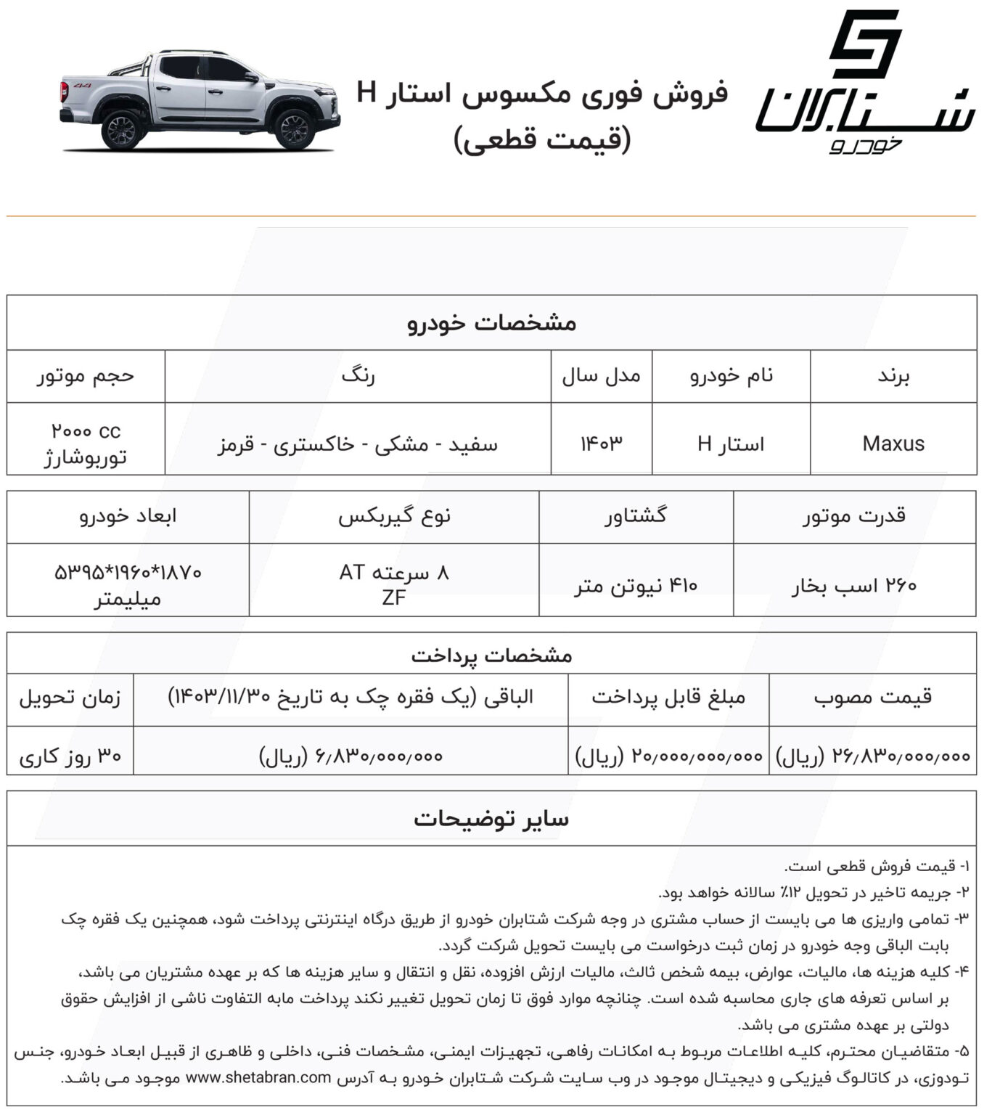 / به تازگی شرکت شتابران قیمت نهایی و شرایط فروش مکسوس H استار را اعلام کرده است و این پیکاپ به زودی به بازار می آید.