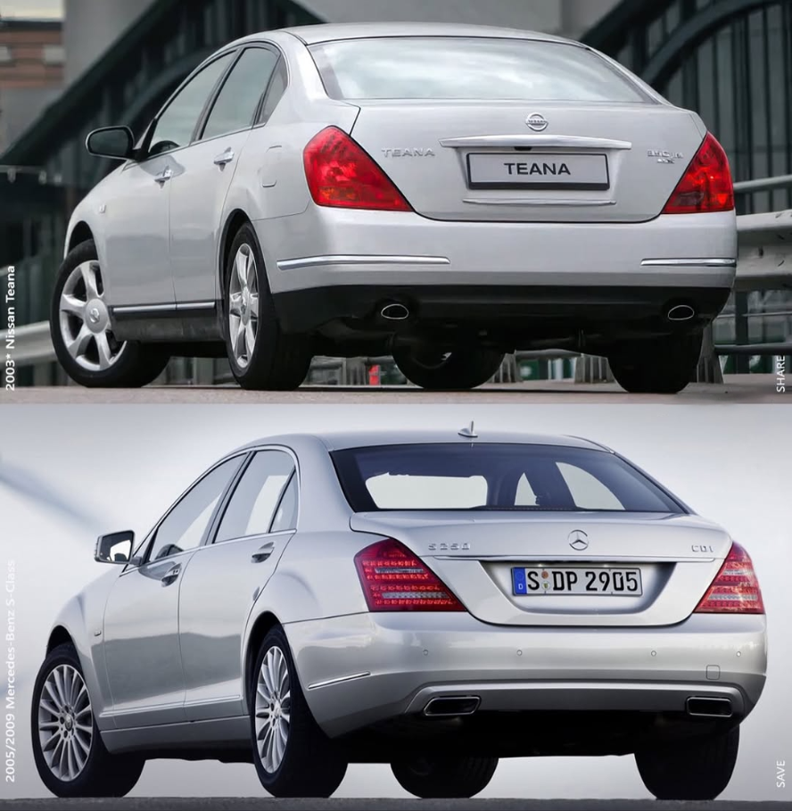 عصر ایران/ در ادامه تصاویری را مشاهده می کنید که شباهت محصولات نیسان در طراحی مرسدس بنز اس کلاس را نشان می دهد. صاحبان حق طراحی نیسان تینا 2003 و سنترا 2005 هستند و محصولی که به کپی کاری متهم شده؛ مرسدس بنز اس کلاس نسل پنجم است.
