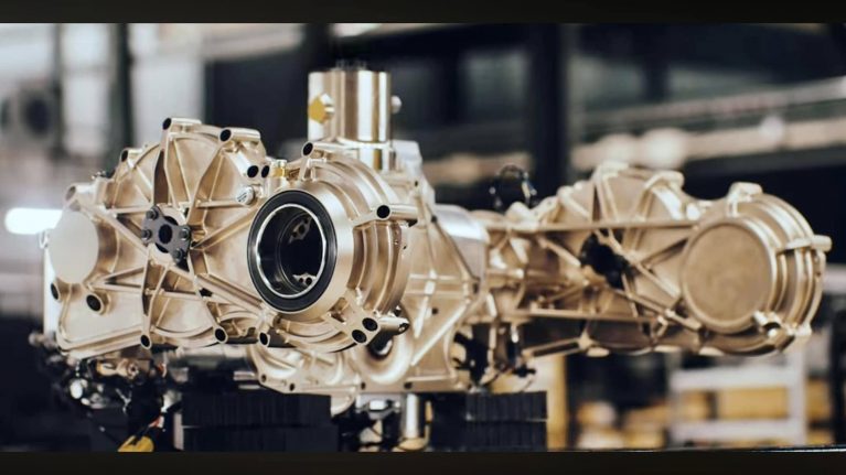 در بخش عقب این خودرو پیشرانه ۸ سیلندر توئین توربو و گیربکس ۹ سرعته موسوم به لایت اسپید توربیون LST قرار دارد. بجای استفاده از سه شاخ پلوس مستقیم که از دیفرانسیل مشتق میشوند، این گیربکس دارای دو جعبه در دو سمت خود است که قدرت را به سمت چرخها هدایت میکنند. گیربکس LST بجای چرخش ۹۰ درجه از شفت خروجی، قدرت را ۲۷۰ درجه میچرخاند تا فضای کافی برای نصب پیشرانه ۸ سیلندر خورجینی وجود داشته باشد. در هر جعبه کلاچی هیدرولیکی قرار دارد که قدرت ورودی به چرخها را تنظیم میکند؛ بنابراین شما سیستمی دارید که همانند یک دیفرانسیل قفل شونده الکترونیکی عمل میکند اما قطعات آن بجای نصب در یک واحد ساده از یکدیگر جدا شدهاند.