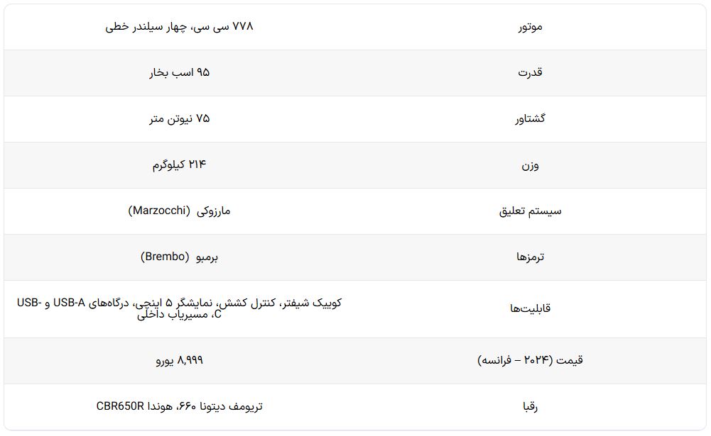 در جدول زیر میتوانید مشخصات کی جی موتور SRK 800 RR را به طور خلاصه مشاهده نمایید.