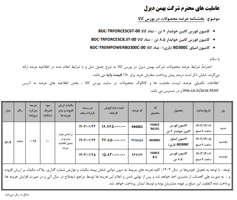 بورس کالای ایران در روزهای شنبه ۴ اسفند، یکشنبه ۵ اسفند و دوشنبه ۶ اسفند ماه سال ۱۴۰۳ از ساعت ۹ صبح تا پایان همان روز به ترتیب میزبان عرضه کامیون فورس ۶ تن کابین خوابدار، کامیون امپاور BD300 باری و کامیون فورس ۸.۵ شرکت بهمن دیزل است.