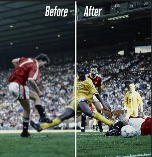 در گزارش ویدئویی منتشرشده در سایت منچستریونایتد، جیسون لیچ (Jason Leach)، تاریخنگار باشگاه منچستریونایتد، میگوید که پردازش هوش مصنوعی باعث شده عناصر نامشخصی مانند تیرهای ساختمانی و جرثقیلهای پسزمینه که در نسخههای اصلی عکسها بهسختی دیده میشدند، آشکار شوند.