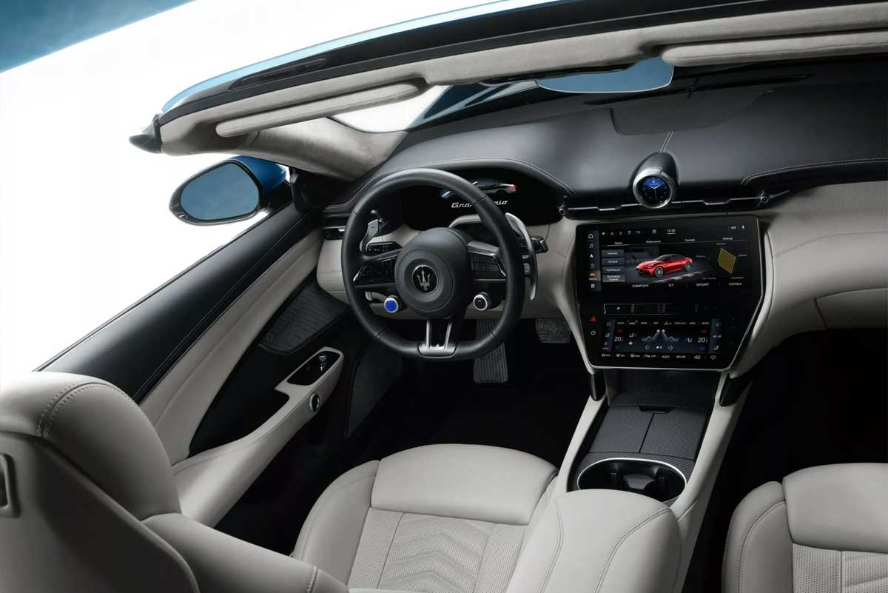 از سوی دیگر، نمونهٔ تک ساخت گرنکابریو با رنگی منحصربهفرد رنگآمیزی شده که یادآور دریاچهٔ یخزده است. تریم سفید براق، رینگهای فورجکاری شده و کالیپرهای ترمز آبی براق هم تکمیلکنندهٔ ویژگیهای بیرونی این نمونهٔ خاص هستند. در داخل هم مازراتی فضایی یخی رنگ را با تریم مشکی و تزئینات فیبر کربنی تدارک دیده که با سقف پارچهای آبی مارین همراه است.