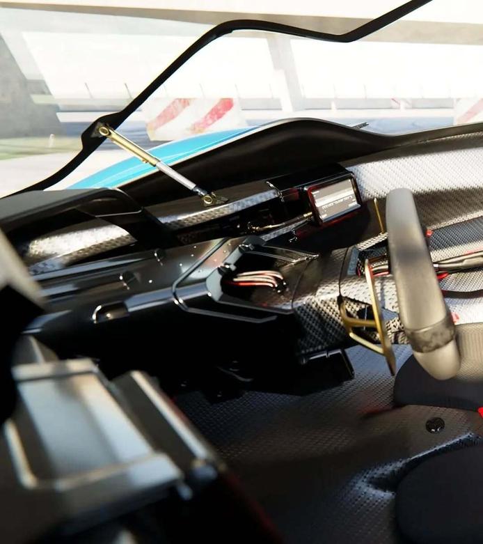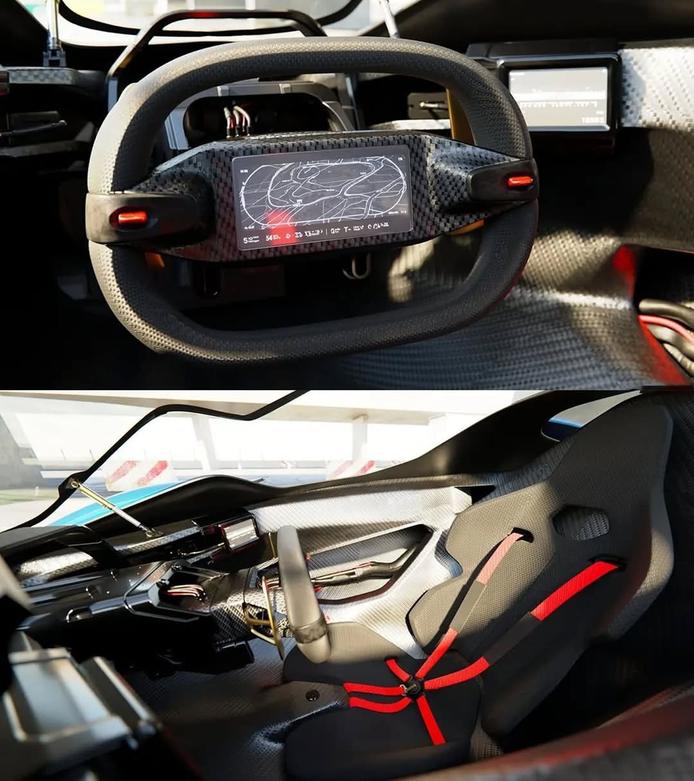 به دنبال سبک جت جنگنده، همه چیز به گونهای پیشنهاد شده که تا حد ممکن خام و کاربردی باشد. چیزهایی مانند فرمان و صفحهنمایشها بر روی براکتهای آلومینیومی ماشینکاری شده نصب شدهاند، با این ایده که با توسعه مهندسی، داخل خودرو نیز تکامل یابد. صفحهنمایشهای قابل تعویض، سیمهای نمایان برای دسترسی سریع به تعویض قطعات، و همه چیز بسیار رانندهمحور طراحی شده است. پکیج صندلیها از ترکیب LaFerrari و Valkyrie استفاده شده و بهترینهای هر دو را به کار گرفته است تا واقعیت بخشیده شود.