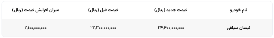 شرکت آمیتیس خودرو به عنوان یکی از عرضه کنندگان نیسان سیلفی به تازگی قیمت نمایندگی این سدان هیبریدی را افزایش داده و در اطلاعیه ای قیمت جدید آن را اعلام کرده است. بر همین اساس قیمت جدید نیسان سیلفی این شرکت ۲۴,۴۰۰,۰۰۰,۰۰۰ ریال اعلام شده است. بد نیست بدانید که تا پیش از این، نیسان سیلفی آمیتیس خودرو با قیمت نمایندگی ۲۲,۳۰۰,۰۰۰,۰۰۰ ریال به فروش می رسید و این به این معنا است که این خودرو به افزایش ۲,۱۰۰,۰۰۰,۰۰۰ ریالی همراه بوده است.