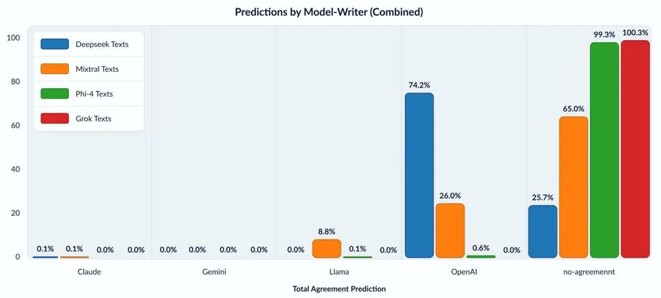 نتیجه قابلتوجه این بود که متنهایی که بیشتر مدلها تولید کرده بودند، سبک منحصربهفردی داشتند اما بخش چشمگیری از خروجیهای DeepSeek از نظر سبک، مشابه خروجیهای OpenAI شناسایی شد.